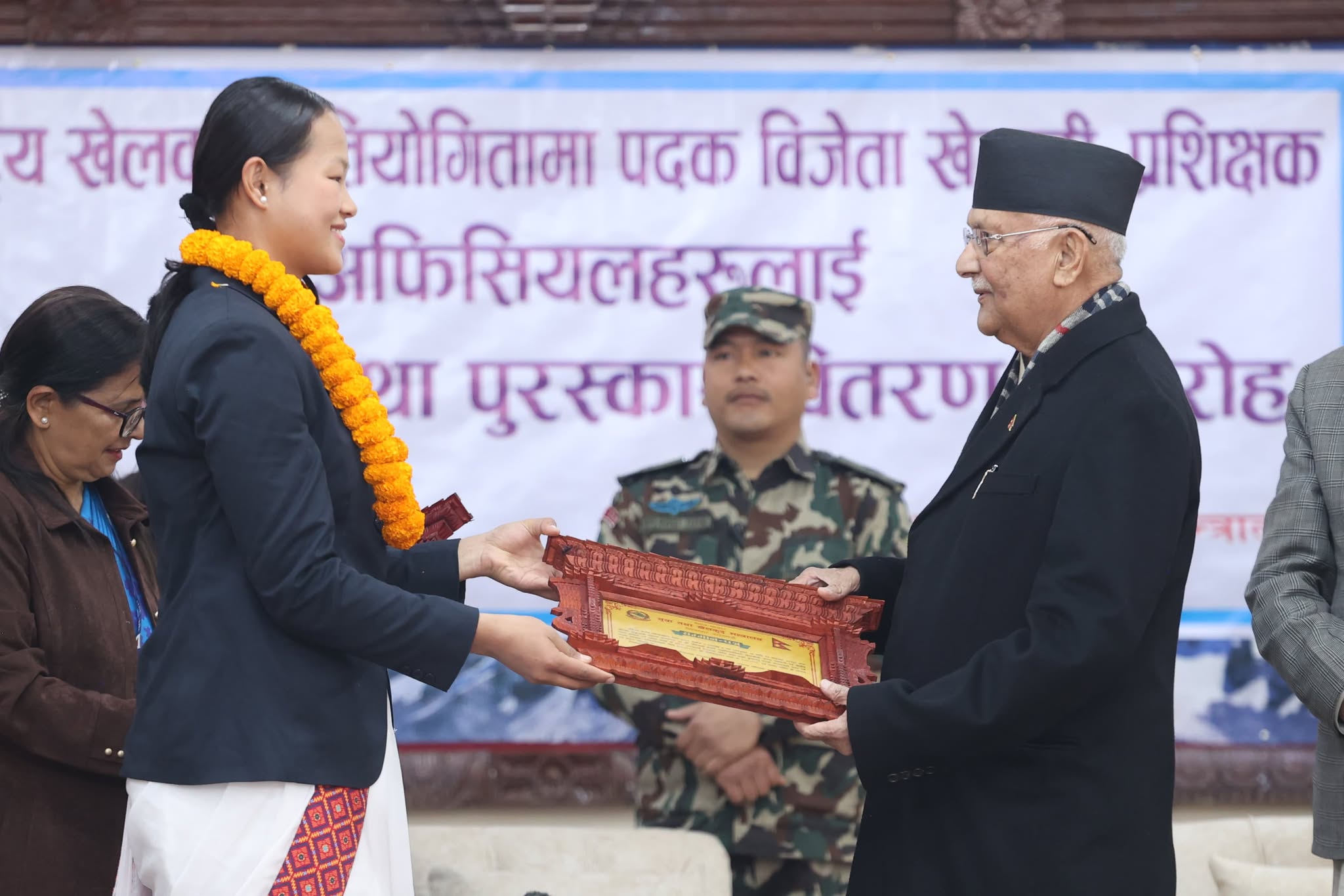Prime Minister KP Sharma Oli handed over cash prizes to the national women’s football team that finished runners up at the SAFF Women’s Championship last year, gold medalist team of CAVA Beach Volleyball and medalists of the Asian Karate Championships.