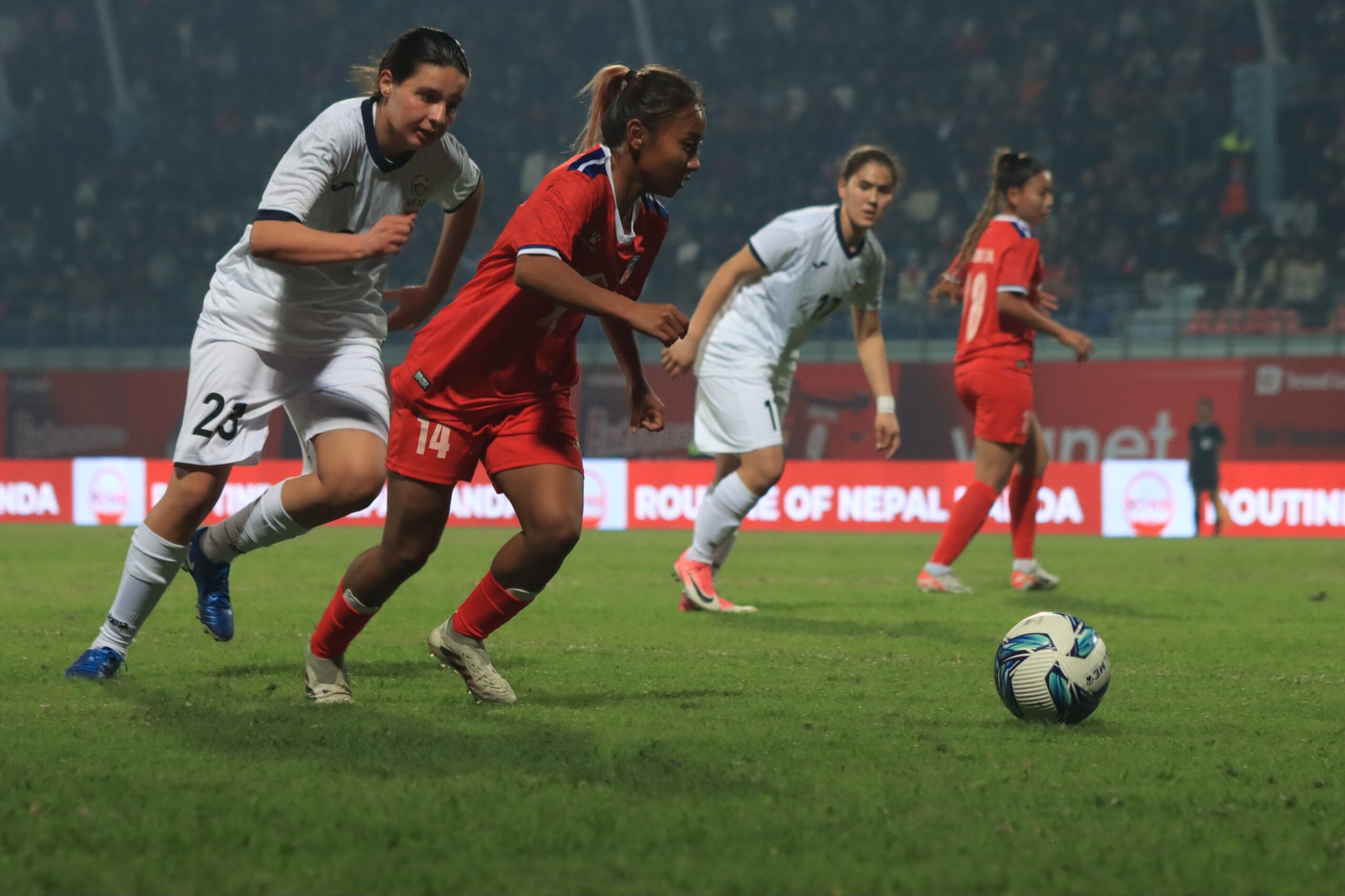 Backed by about seven thousand Nepali supporters, Nepal kept Kyrgyzstan goalkeeper Dilnaru Abibulla Kyzy busy registering almost dozen attempts on goal throughout the game.