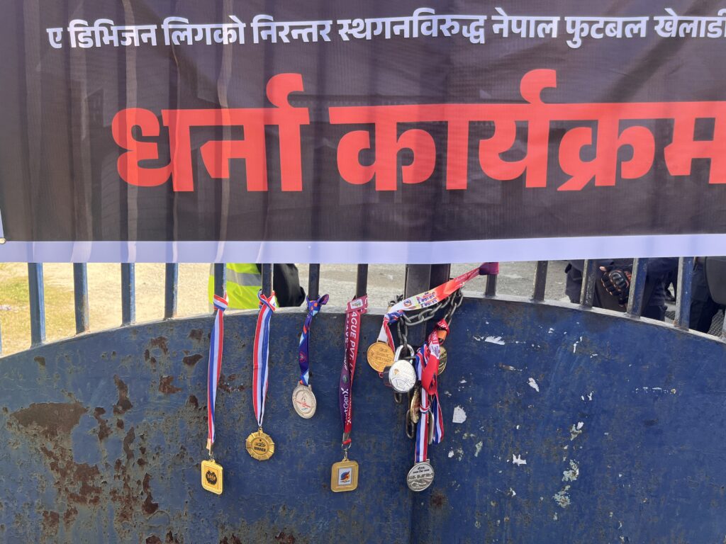 In a symbolic act of protest, the footballers hung their medals on the ANFA gate — a powerful expression of frustration over what they see as the administration’s apathy toward Nepali football.